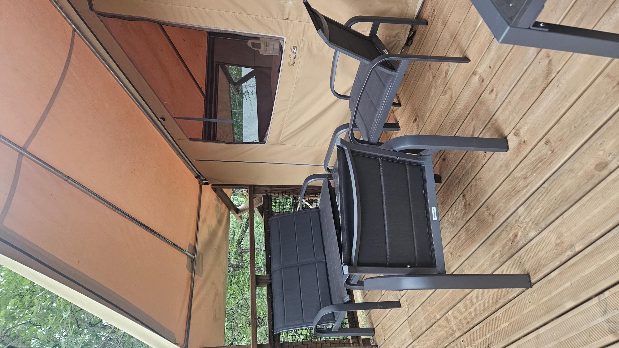 In diesem Cotton Lodge-Zelt im Herzen der Natur genießen Sie einen komfortablen Innenraum von fast 30 m², möbliert, ausgestattet, mit überdachter Terrasse, für bis zu 5 Personen.