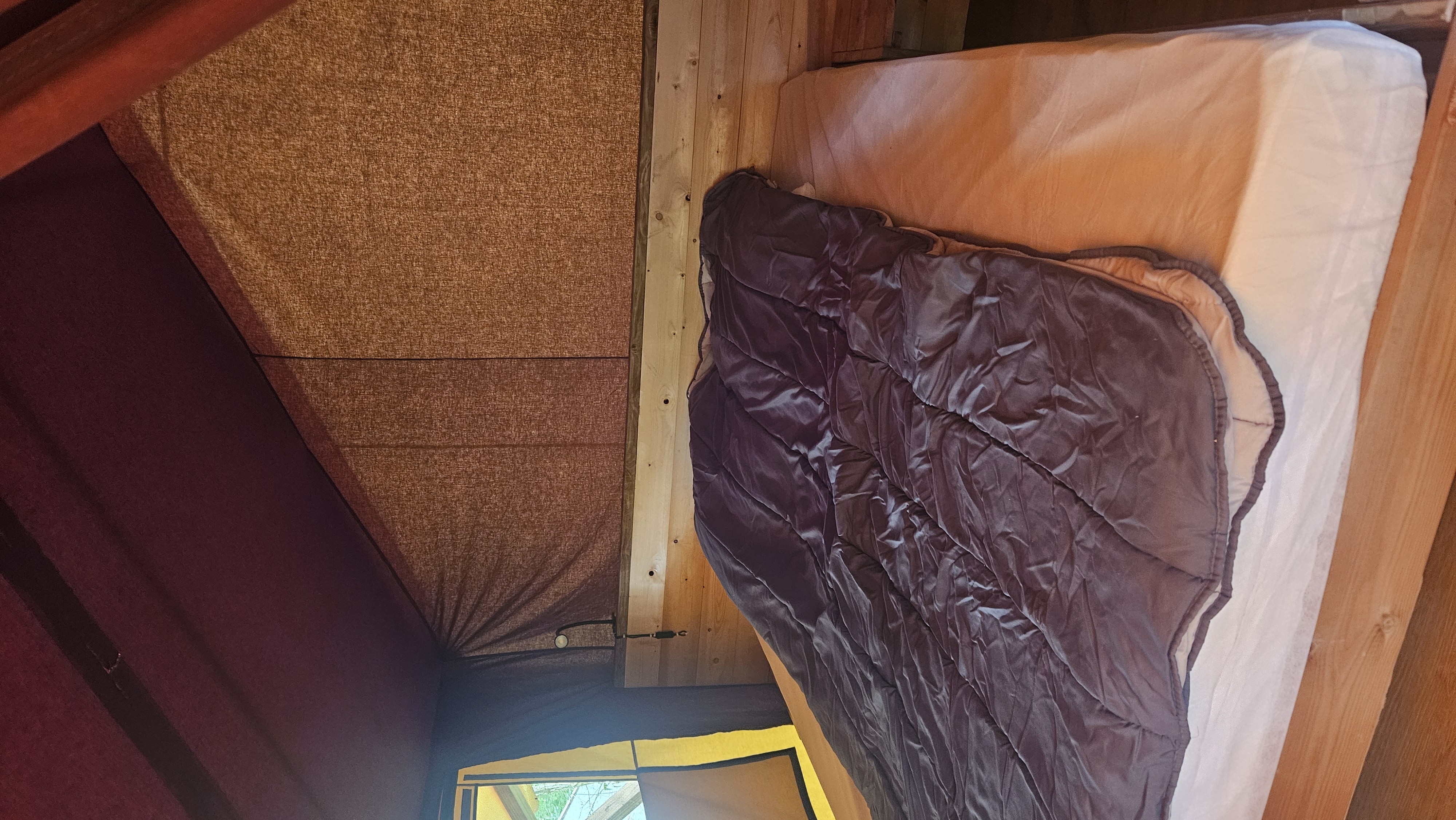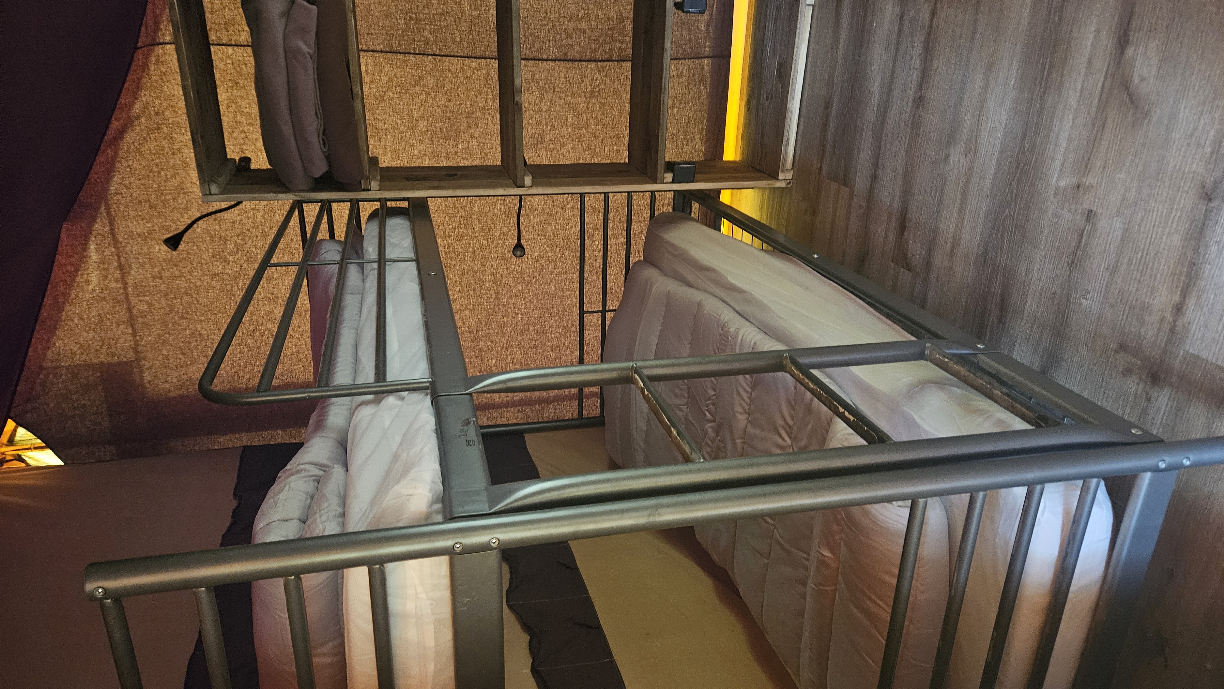 Die 34 m² des Lodge-Zeltes beherbergen nämlich zwei Zimmer: ein Erwachsenenzimmer mit einem Doppelbett für zwei Personen und ein zweites Kinder-/Freundezimmer mit drei Einzelbetten, davon zwei Etagenbetten.