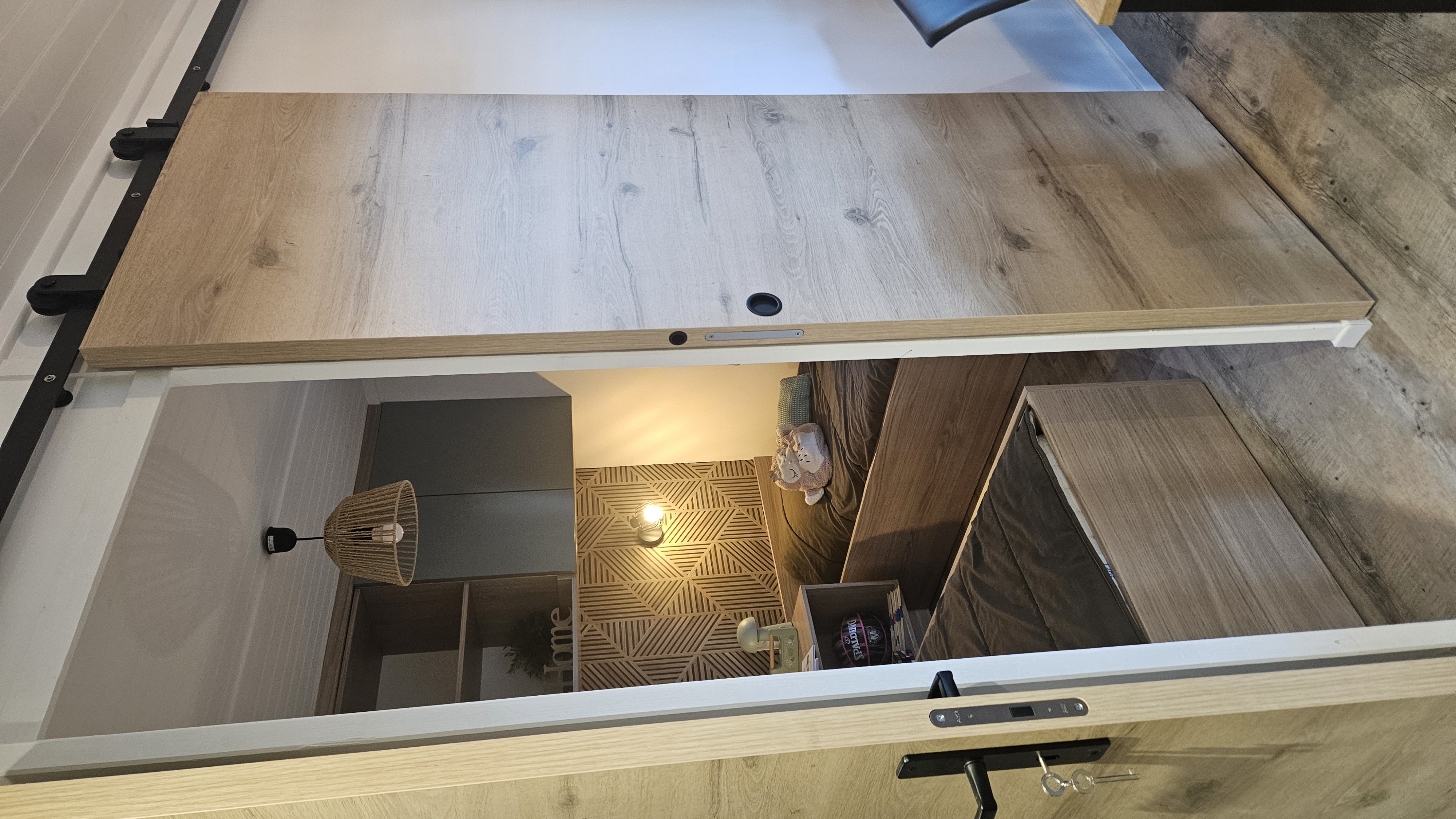 Ainsi, il se compose en plus de la pièce de séjour de deux chambres séparées : une chambre adulte avec un grand lit double, une chambre enfants / amis avec trois couchages, deux lits simples et un lit superposé.